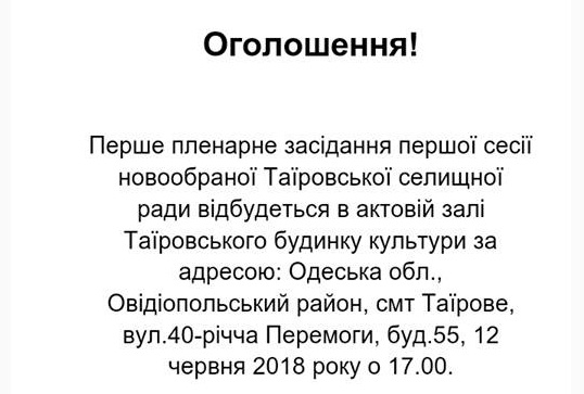 Напомним, новоизбранные депутаты Таировской объединенной территориальной громады попросили местную избирательную комиссию еще раз попробовать созвать сессию поселкового совета. Депутаты предлагали собраться 6 июня.
