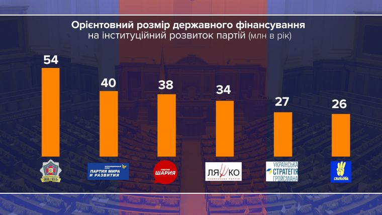Наибольшую долю получит президентская партия «Слуга народа» - 537 миллионов гривень ежегодно. Дальше финансирование, возможно, распределится так: «Оппозиционная платформа - за жизнь» - 141 млн в год, «Европейская солидарность» - 109, «Батькивщина» - 93, «Голос» - 77 миллионов гривень в год.