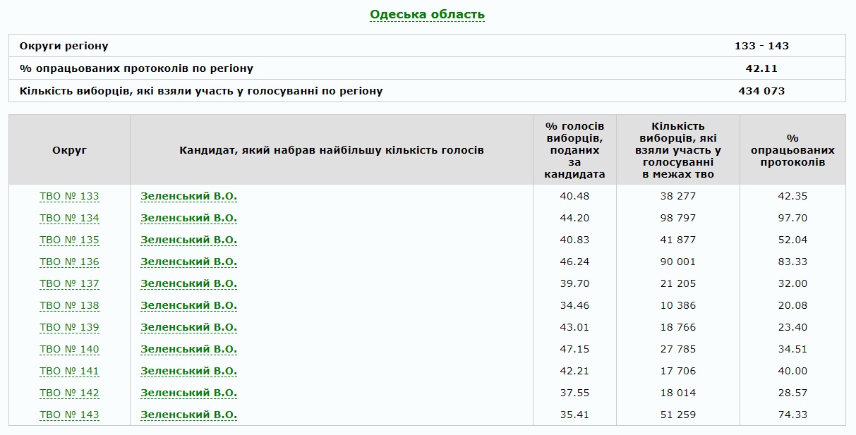 Как следует из данных Центральной избирательной комиссии, больше всего протоколов обработали в округе №134 (Малиновский район Одессы) — 97,7% протоколов и тут лидирует Владимир Зеленский (44.2%), а на втором месте Юрий Бойко (19,25%).