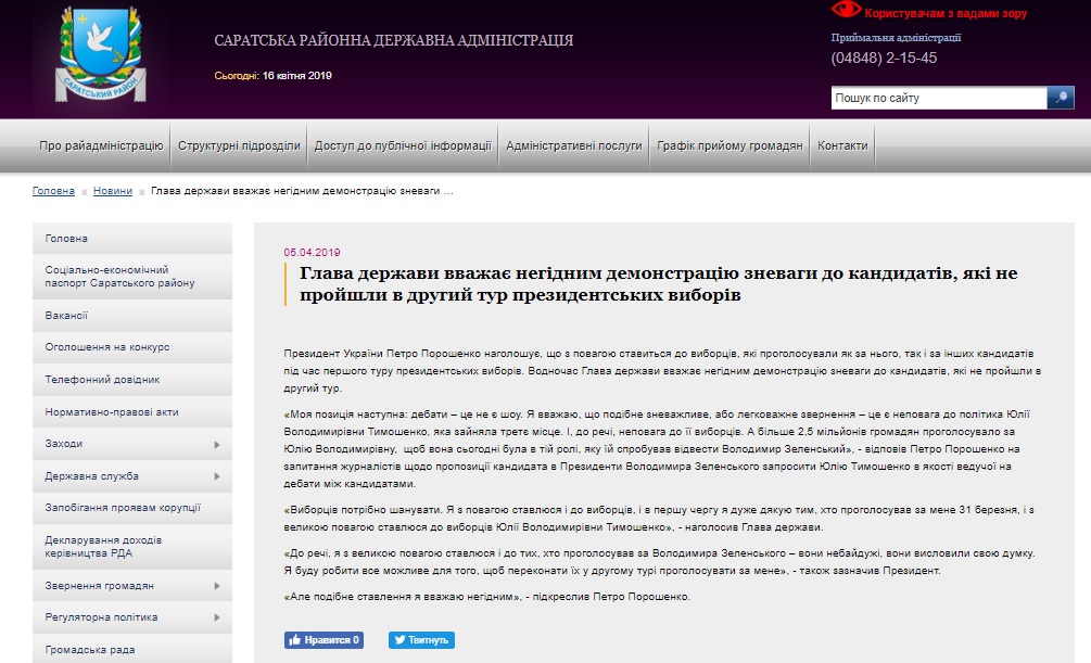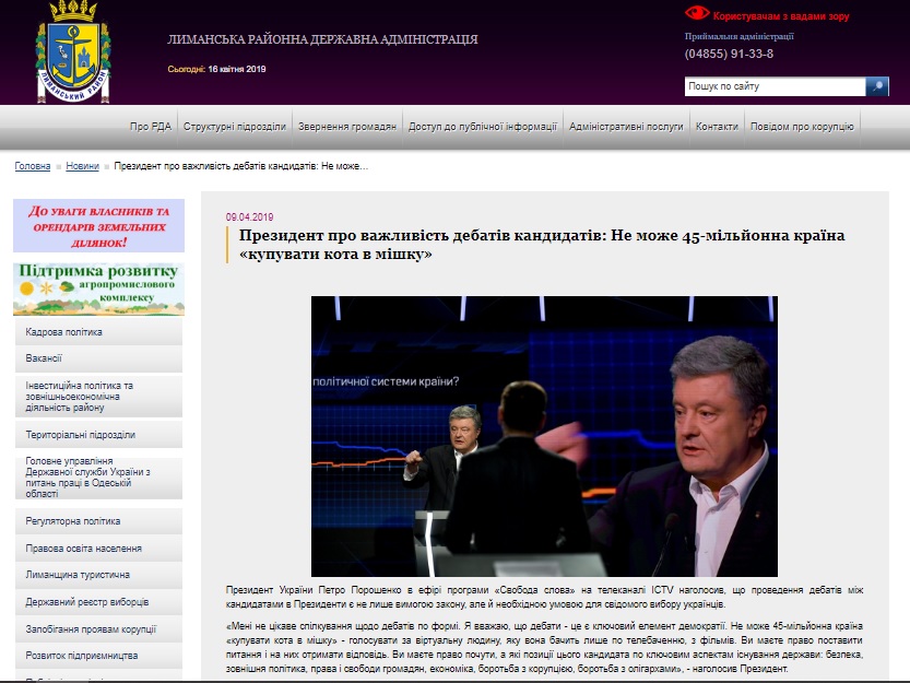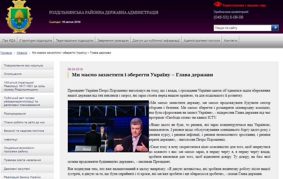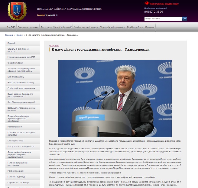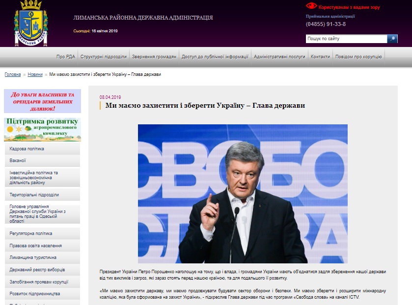 В первой половине апреля сайты районных государственных администраций Одесской области неоднократно размещали информацию о деятельности кандидата на пост президента Украины и действующего президента Петра Порошенко.