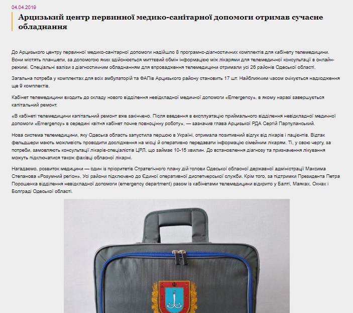 Пять РГА разместили сообщение о приобретении медицинского оборудования, в которых упоминался кандидат Петр Порошенко. 4 апреля на сайте Арцизской РГА размещено сообщение с таким текстом: «Арцизский центр первичной медико-санитарной помощи получил современное оборудование [...] Напомним, развитие медицины - один из приоритетов Стратегического плана действий председателя Одесской областной государственной администрации Максима Степанова «Умный регион». Все районы подключены к Единой оперативной диспетчерской службы. Кроме того, при поддержке Президента Петра Порошенко отделения неотложной помощи (еmergency department) вместе с кабинетами телемедицины открыто в Балте, маяк, Окнах и Болграде Одесской области».