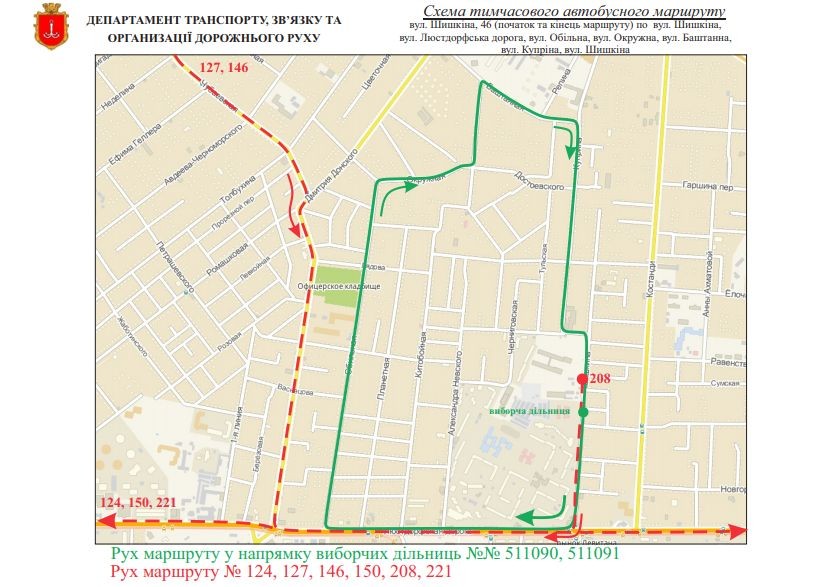 С 8:00 до 20:00 21 июля 2019 года дополнительные маршруты транспорта будут работать по определенным схемам движения. К избирательным участкам № 511090 (ул. Репина) и № 511091(ул. Шишкина, 46) - один автобус с интервалом движения в один час по маршруту движения: ул. Шишкина, 46 (начало и конец маршрута) по ул. Шишкина, Люстдорфская дорога, ул. Обильная, ул. Окружная, ул. Баштанная, ул. Куприна, ул. Шишкина.