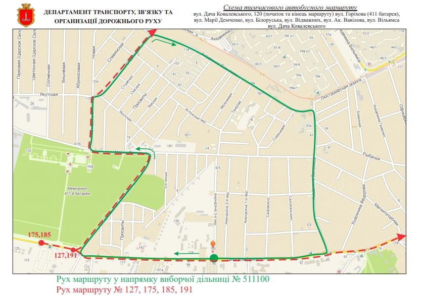 К избирательному участку № 511100 (ул. Дача Ковалевского, 120 - начало и конец маршрута) - один автобус с интервалом движения в один час по маршруту движения: ул. Дача Ковалевского, ул. Ореховая (411 батарея), ул. Марии Демченко, ул. Белорусская, ул. Отважных, ул. Ак. Вавилова, ул. Вильямса, ул. Дача Ковалевского.