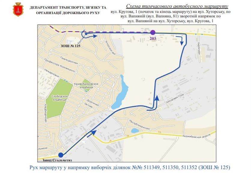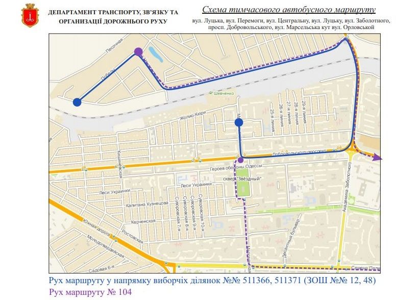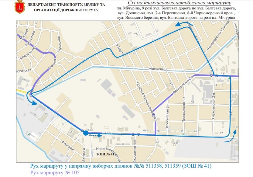 На избирательные участки №№ 511358, 511359 - один автобус с интервалом движения в один час по маршруту движения: пл. Мичурина, 9 угол Балтской дороги по Балтской дороге, ул. Долинская, ул. 7-ая Пересыпская, 8-ой Черноморский пер., ул. Восьмого марта, Балтская дорога угол ул. Мичурина.