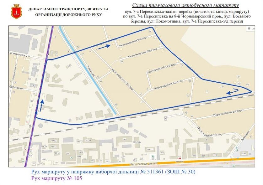 На избирательный участок 511361 - один автобус с интервалом движения в один час по маршруту движения: ул. 7-ая Пересыпская - железнодорожный переезд (начало и конец маршрута) по ул. 7-ая Пересыпская на 8-ой Черноморский пер., ул. Восьмого марта, ул. Локомотивная, ул. 7-ая Пересипская - железнодорожный переезд.