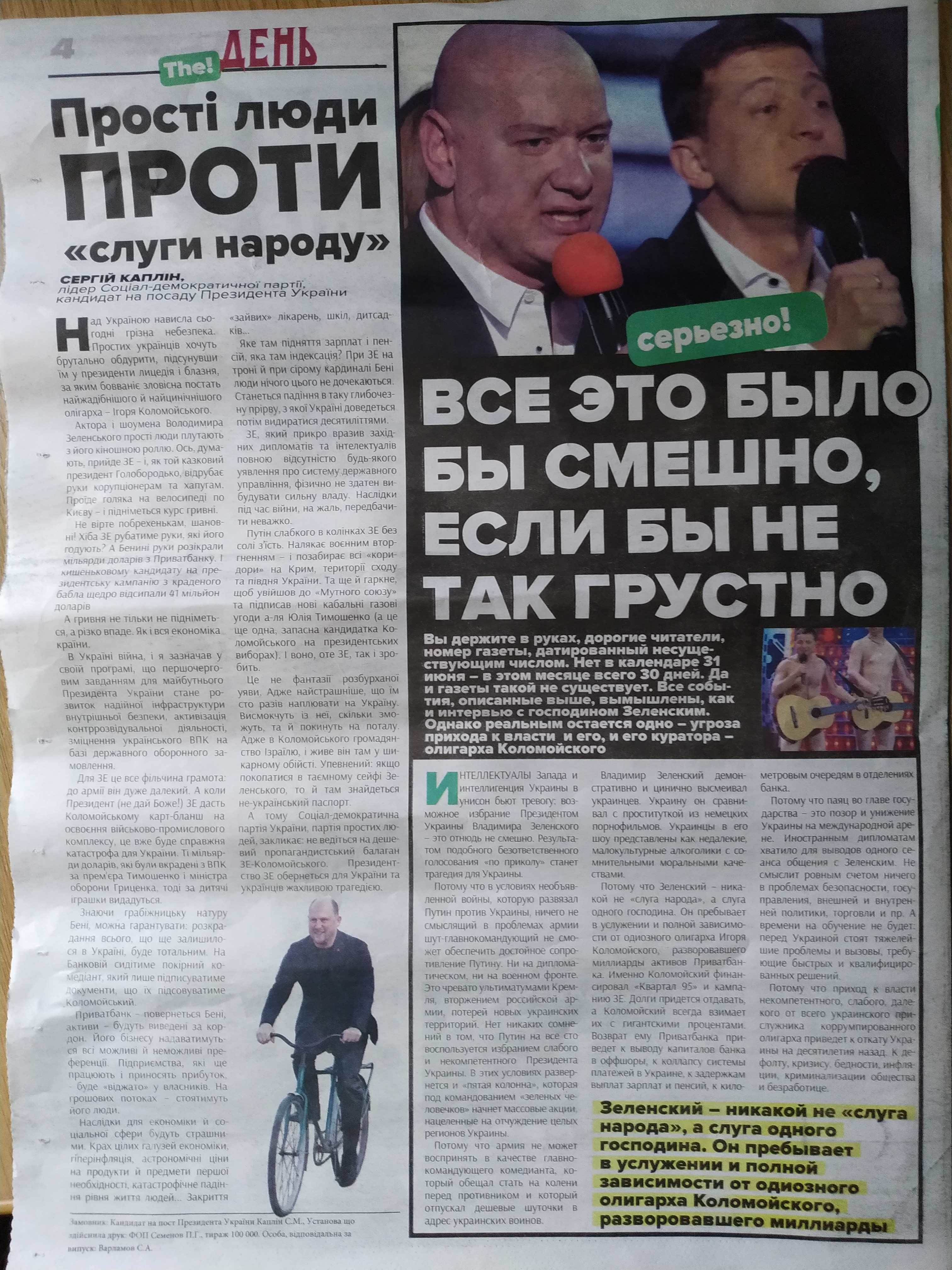 «Газета Зе День о которой сегодня говорит вся страна изготовлена СДП и мной лично, ее печать оплачена из избирательного фонда в соответствии с требованиями действующего законодательства. [...] Ознакомившись с программой, мы решили ответить ему в стиле кандидата», - пояснил Сергей Каплин.