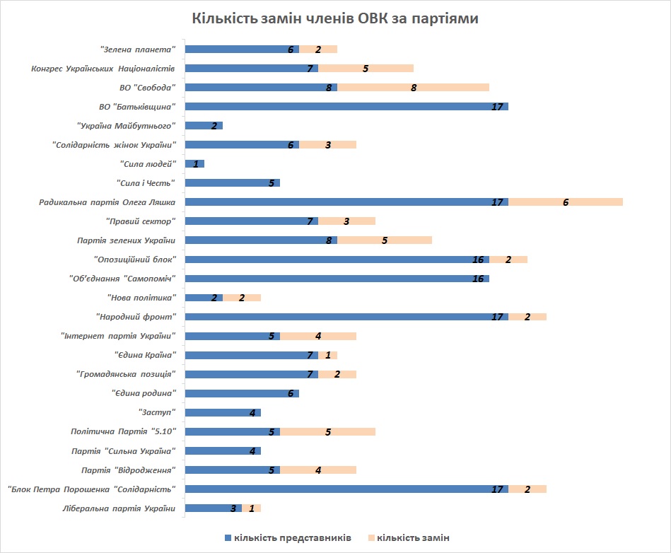Больше ротаций зафиксировано среди представителей партии ВО «Свобода» - все восемь представителей и «5.10» - все пятеро. Ни представителя не меняли в партиях ВО «Батькивщина», «Украина будущего», «Сила и Честь», «Объединение «Самопомощь», «Всеукраинское политическое объединение «Единая семья», «Всеукраинское аграрное объединение «Заступ» и «Сильная Украина».