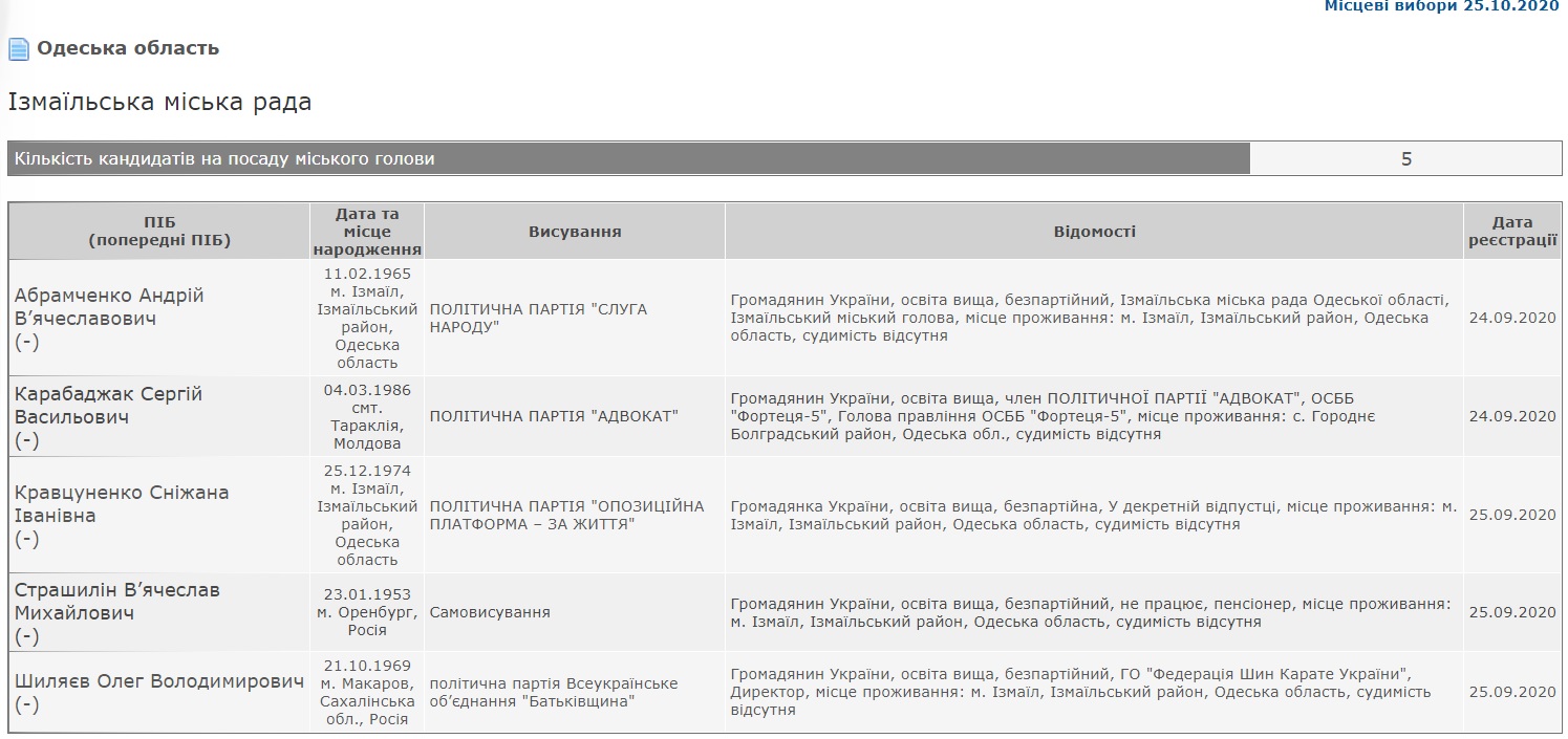 Измаильская городская территориальная избирательная комиссия зарегистрировала пять кандидатов на пост городского головы.