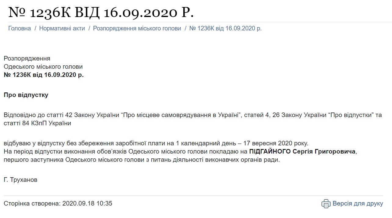 Зачем мэру понадобился лишний выходной в распоряжении не указано, однако 17 сентября состоялась партийная конференция партии одесского мэра «Доверяй делам», на которой политическая сила определилась со списком своих кандидатов в депутаты Одесского городского совета.