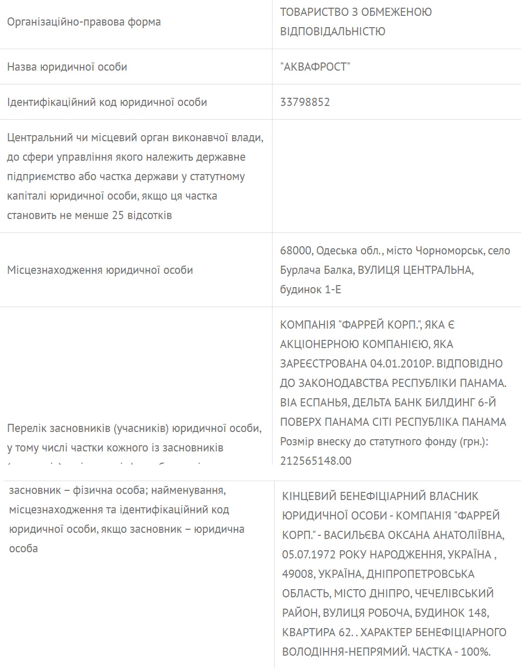 ООО «Аквафрост» основано в 2005 году и зарегистрировано в Черноморске. Основатель панамская компания «Фаррей корп», конечный бенефициар - Оксана Васильева из Днепра.