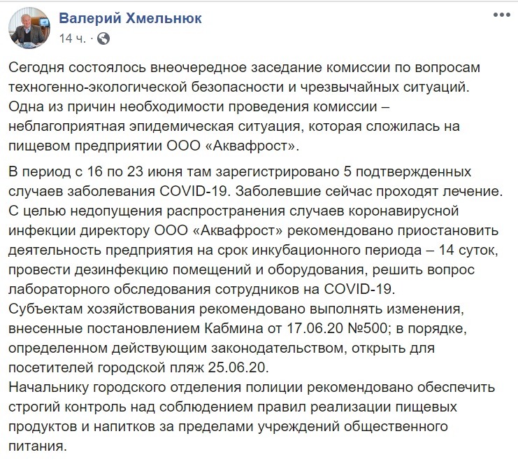 «Субъектам хозяйствования рекомендовано выполнять изменения, внесенные постановлением Кабмина от 17 июня; в порядке, определенном действующим законодательством, открыть для посетителей городской пляж 25 июня. Начальнику городского отделения полиции рекомендовано обеспечить строгий контроль над соблюдением правил реализации пищевых продуктов и напитков за пределами учреждений общественного питания», - написал мэр.