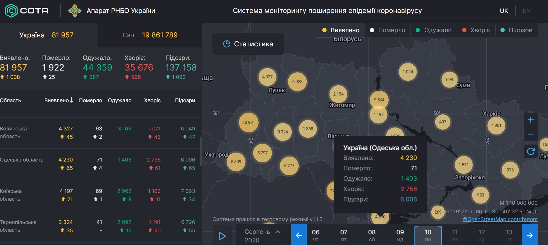 В Украине зафиксирована 1 тысяча 8 новых случаев коронавирусной болезни COVID-19. 10 августа (по состоянию на 9:00) в Украине 81 тысяча 957 лабораторно подтвержденных случаев COVID-19, из них 1 тысяча 922 летальные, 44 тысячи 359 пациентов выздоровели. Всего проведен 1 миллион 179 тысяч 434 тестирования методом ПЦР. Всего за сутки выписаны 387 пациентов.