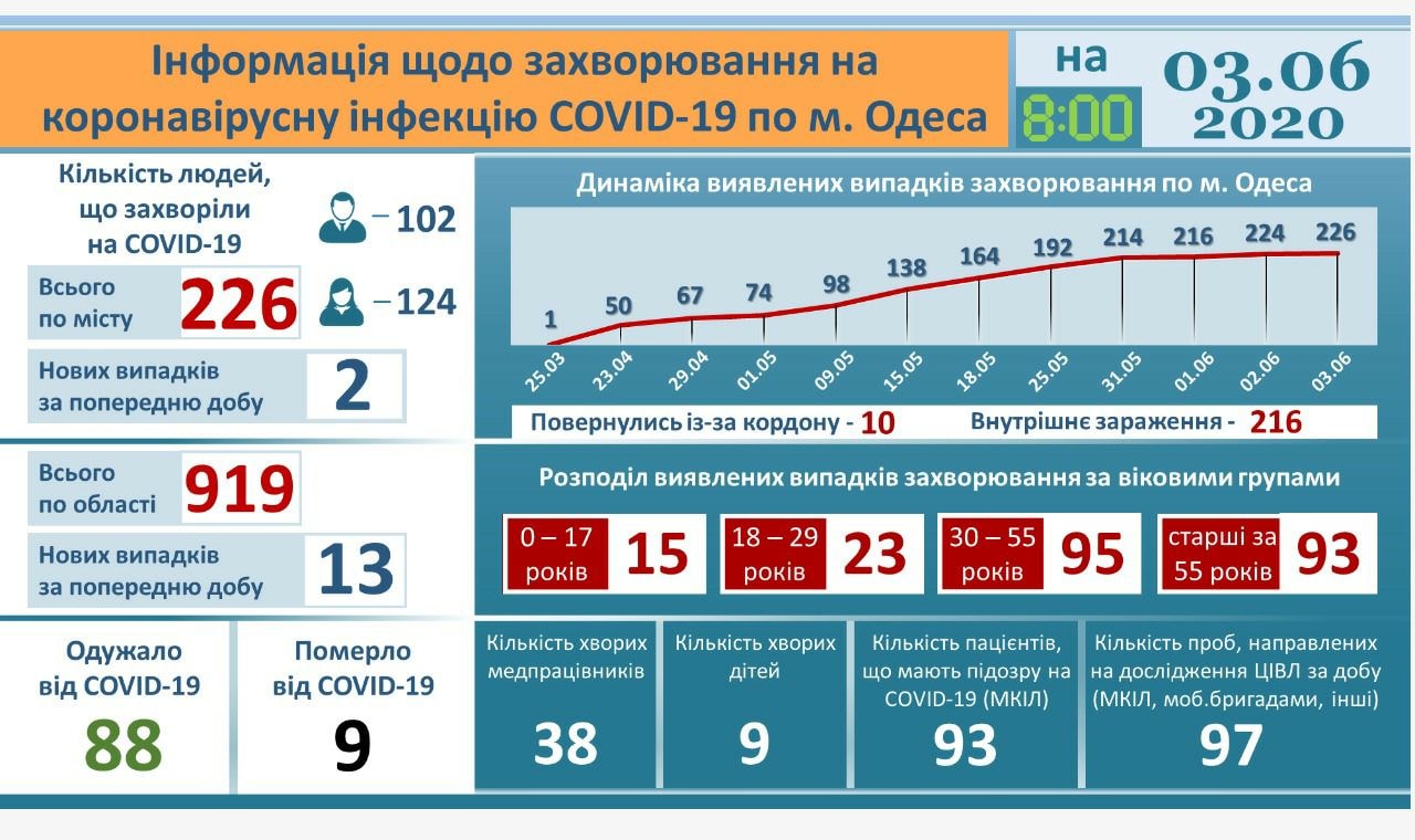 Количество подтвержденных случаев COVID-19 в Одесской области, на утро 3 июня, по данным главы Одесской областной администрации Максима Куцего, достигло 919 человек.