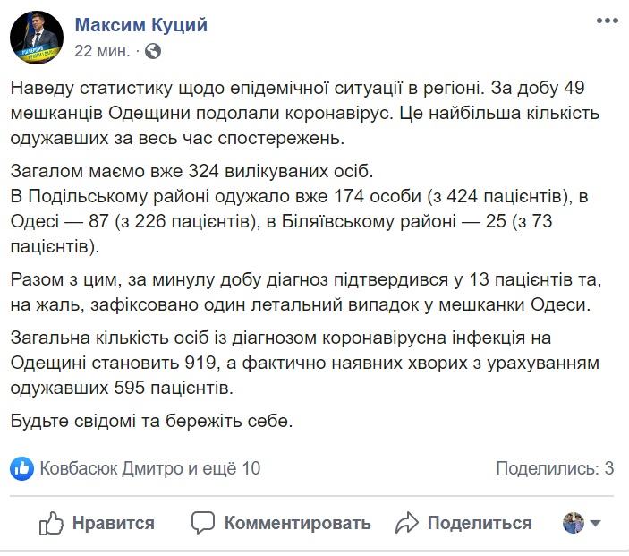 «В общем имеем уже 324 вылеченных человек. В Подольском районе выздоровели уже 174 человека (из 424 пациентов), в Одессе - 87 (из 226 пациентов), в Беляевском районе - 25 (из 73 пациентов)», - написал Максим Куцый.