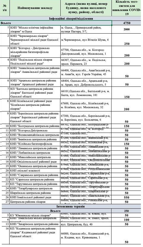 Тесты распределили между 27 больницами, которые либо специализируются на лечении инфекций как одесская, либо имеют инфекционные отделения. Большинство получили по 50 тестов, а некоторые немного больше.
