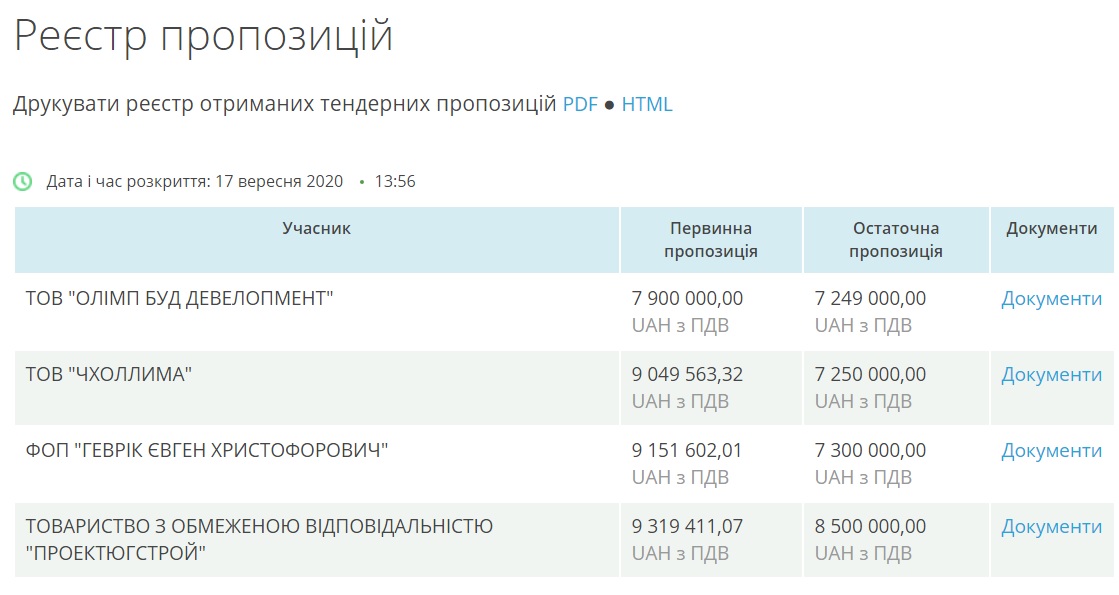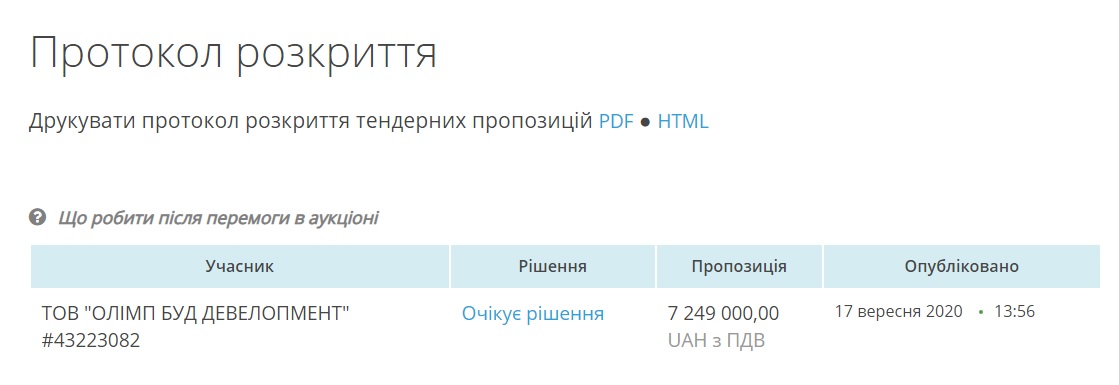 Победителем признали ООО «Олимп Буд Девелопмент», которое на втором шаге аукциона согласилось работать за 7 миллионов 249 тысяч гривень.