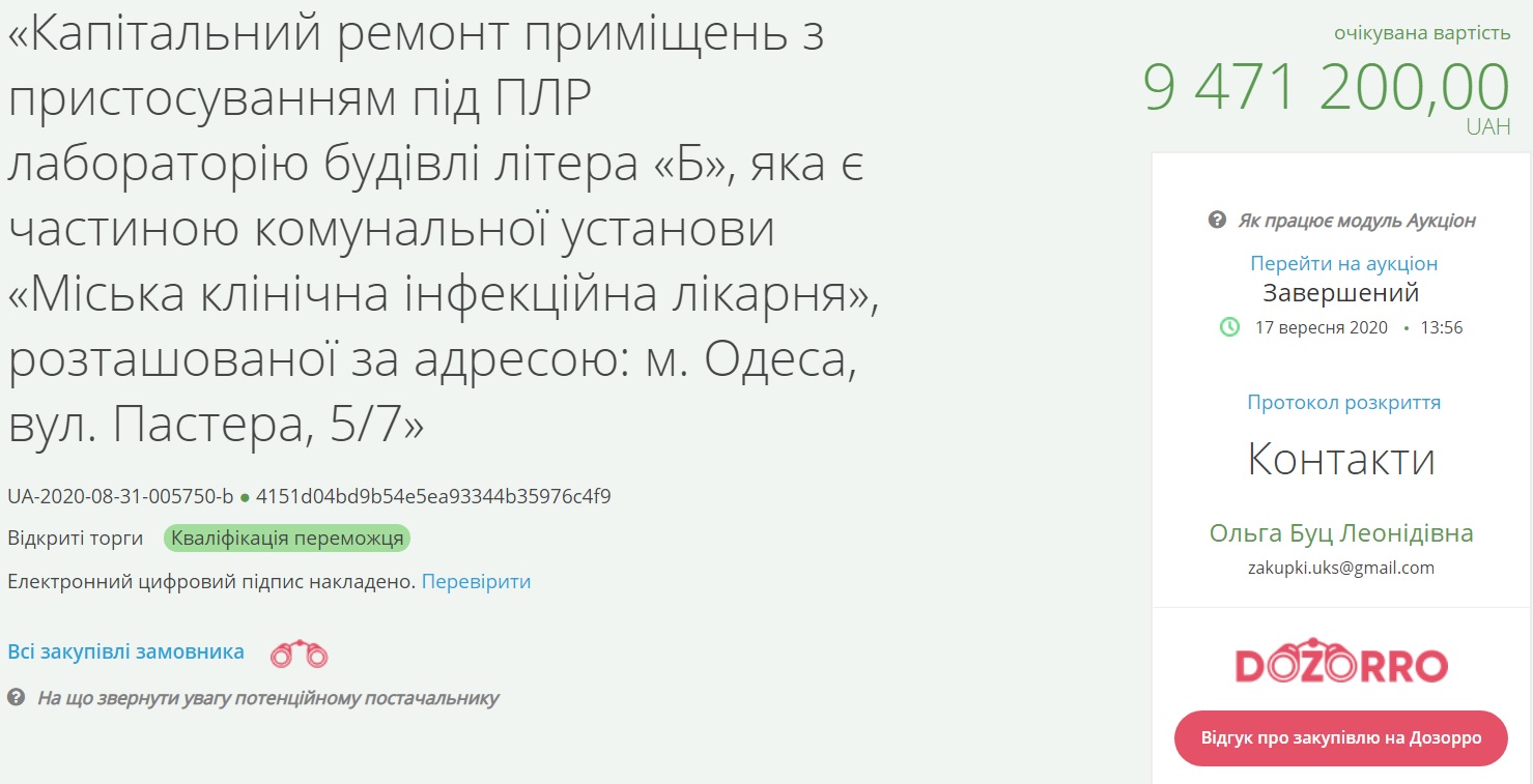 Управление капитального строительства Одесского городского совета провело тендер для выбора компании, которой заплатят за капитальный ремонт помещений с приспособлением под ПЦР-лабораторию здание, которое является частью коммунального учреждения «Городская клиническая инфекционная больница».