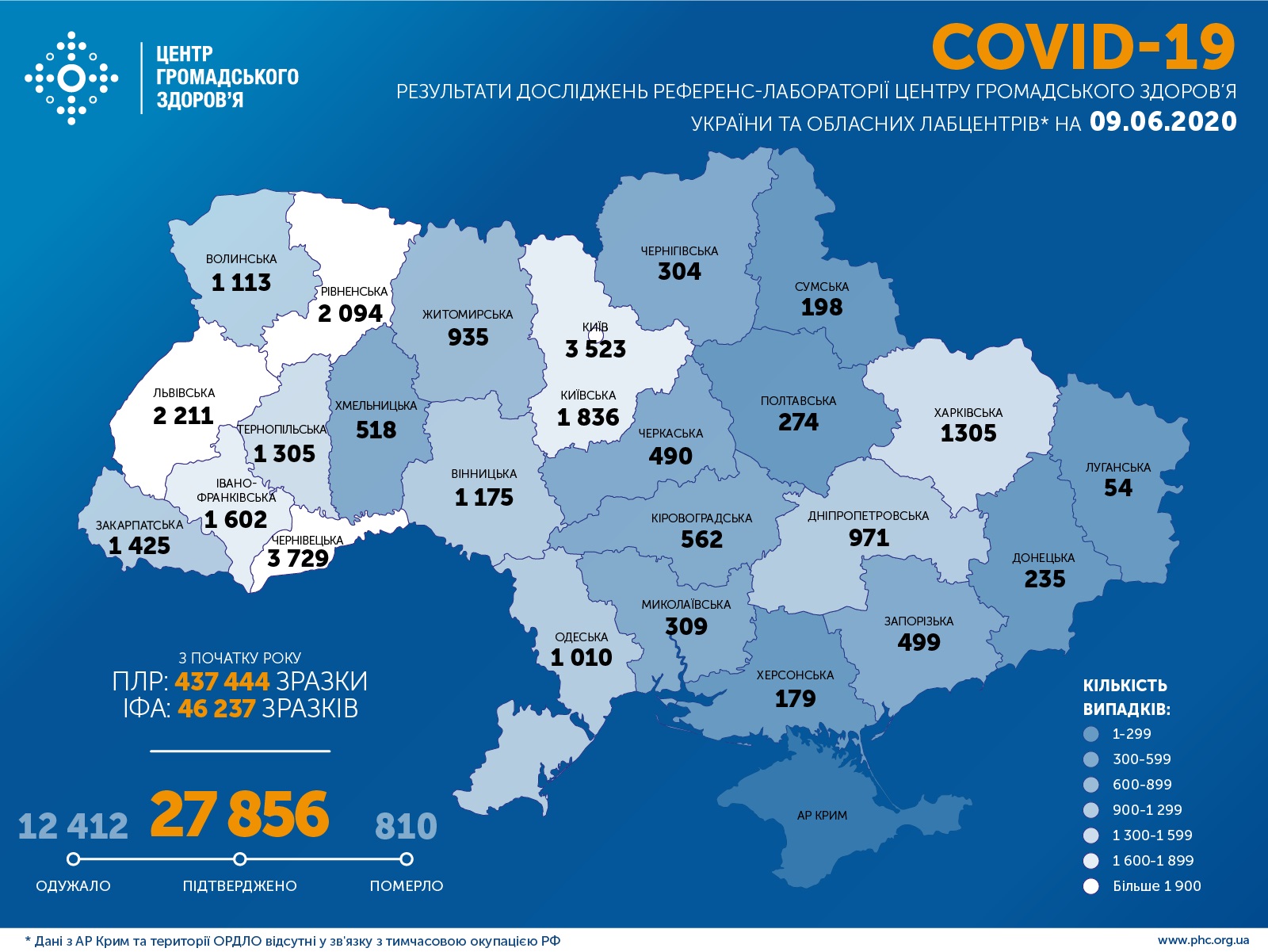 В целом в Украине подтверждены 27 тыс.856 случаев COVID-19, из них 12 тыс. 412 выздоровели, 810 умерли. За последние сутки лабораторно подтверждено 394 случая.