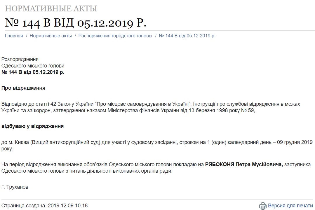 Одесский городской голова Геннадий Труханов подписал распоряжение об однодневной командировке себя в Киев.