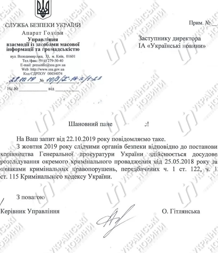 Дело находится в производстве СБУ с октября. Расследование проводится по части 1 статьи 122 и части 1 статьи 115 Уголовного кодекса.