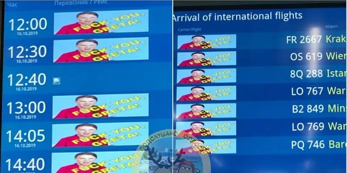Из-за оскорбительной надписи про Грету Тумберг на табло Одесского аэропорта СБУ обыскивает кибер-активистов