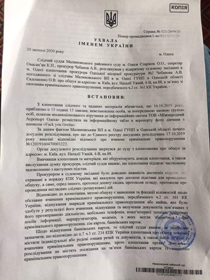 Как следует из определения суда, уголовное производство начали после того, как на табло «Международного аэропорта «Одесса»» появилась фотография шведской активистки Греты Тумберг с надписью на английском языке: «Fuck you, Greta»