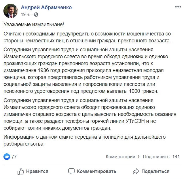 Мэр уточнил, что сотрудники управления труда и социальной защиты населения Измаильского городского совета обходят дома одиноких пожилых измаильчан с цель выяснить необходимость оказания помощи, а также раздают телефоны горячей линии УТиСЗН, но при этом не собирают копии никаких документов.