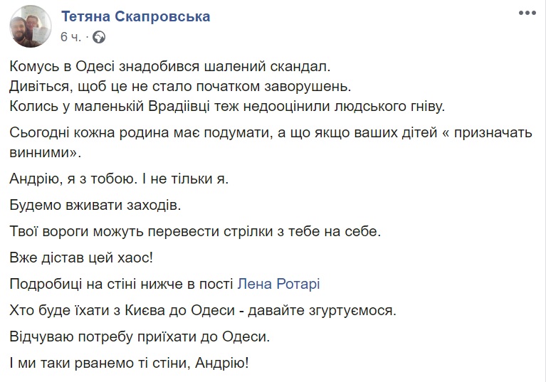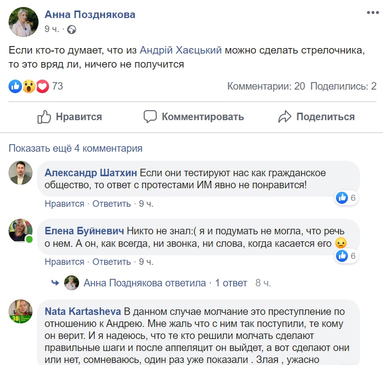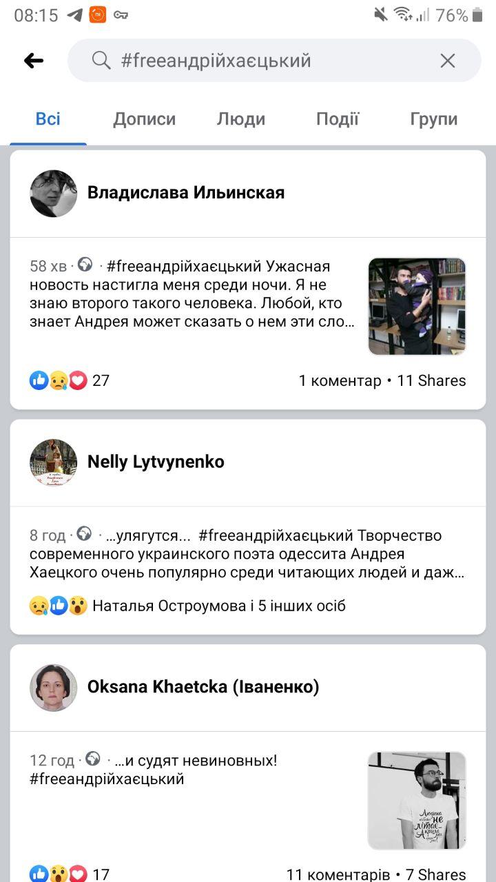 В поддержку Андрея Хаецкого высказались в соцсети: волонтер и бывшая глава Любашевской РГА Татьяна Скапровкая, активист Лучезар Панфилов, недавно уволенный заместитель главы Одесской ОГА Виталий Свичинский, директор Южного отделения Института национальной памяти Украины Сергей Гуцалюк, депутат Одесского городского совета Анна Позднякова и многие другие.