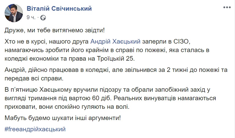 В социальной сети Facebook журналисты и общественники запустили флешмоб в поддержку Андрея Хаецкого, бывшего заместителя директора Одесского колледжа экономики и права, здание которого на Троицкой сгорело в декабре прошлого года.