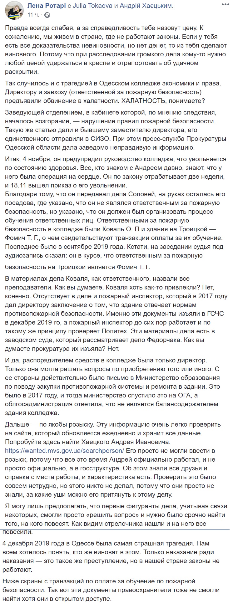 При этом она также отмечает, что Андрей Хаецкий уволился с должности 18 ноября и ответственным за пожарную безопасность в колледже не являлся, более того, обеспечил подготовку ответственных. За пожарную безопасность в колледже в целом отвечал Коваль О.О., а за пожарную безопасность конкретно в здании на Троицкой, 25, Фомич Т.Г.