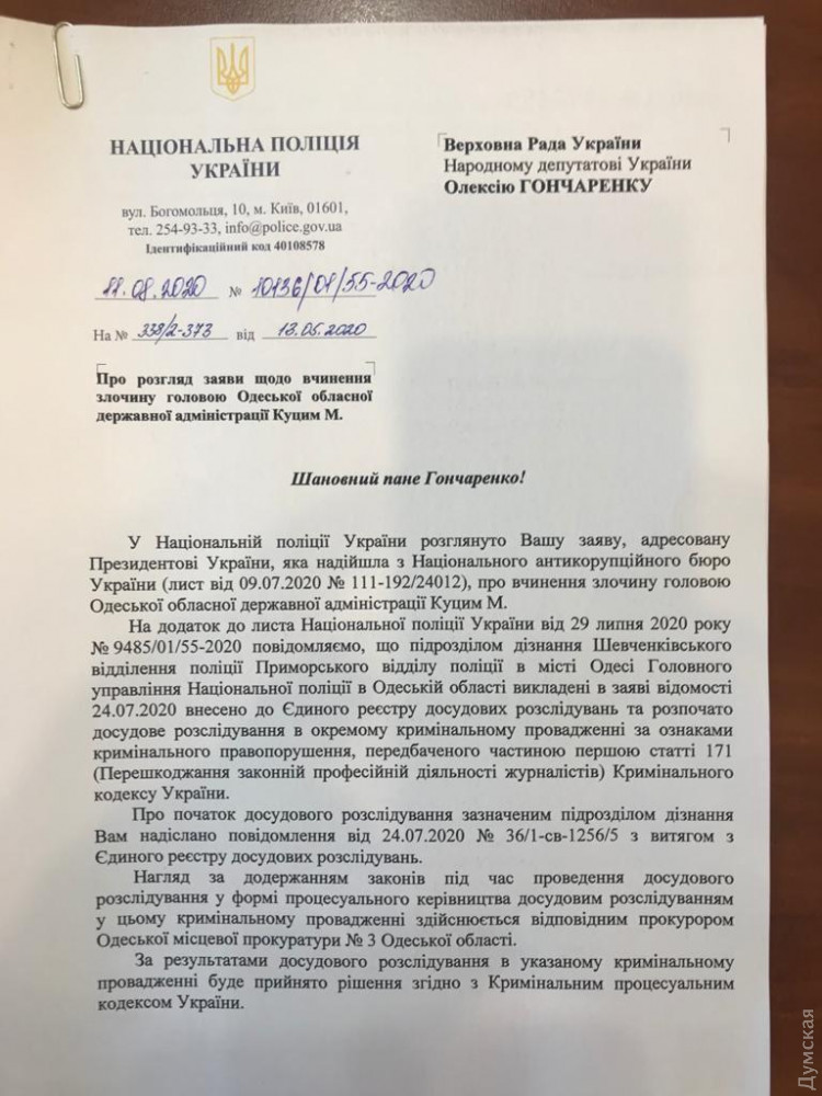 Дознаватель Шевченковского отделения полиции Одессы открыл уголовное производство по факту инцидента, который имел место в мае этого года в кабинете главы облгосадминистрации Максима Куцего.