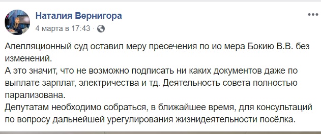 «Апелляционный суд оставил меру пресечения и.о. председателю Бокию В.В. без изменений. А это значит, что невозможно подписать никаких документов, даже по выплате зарплат, электричества и т.д. Деятельность совета полностью парализована. Депутатам необходимо собраться в ближайшее время для консультаций по вопросу дальнейшей урегулирования жизнедеятельности поселка», - написала депутат.