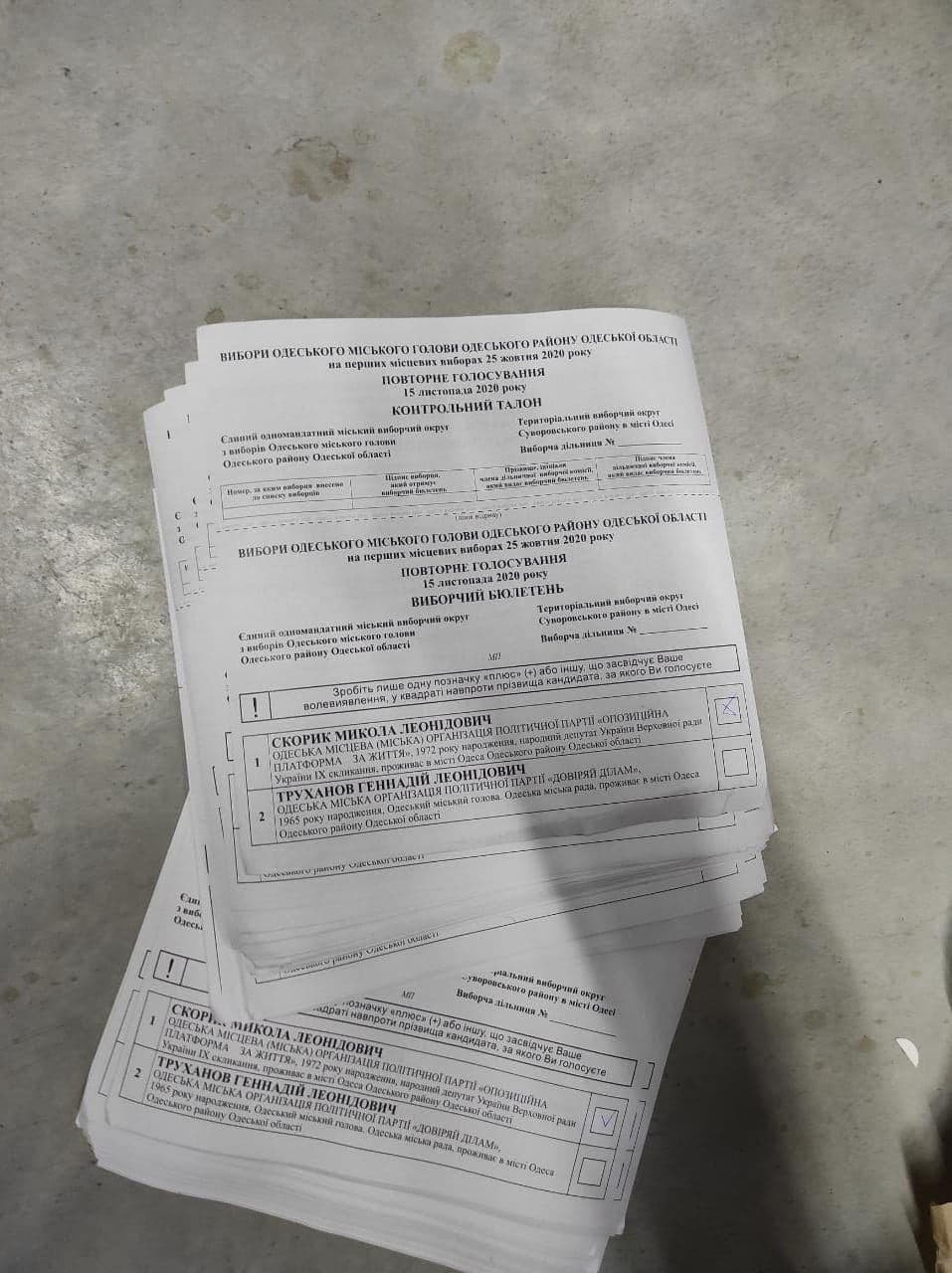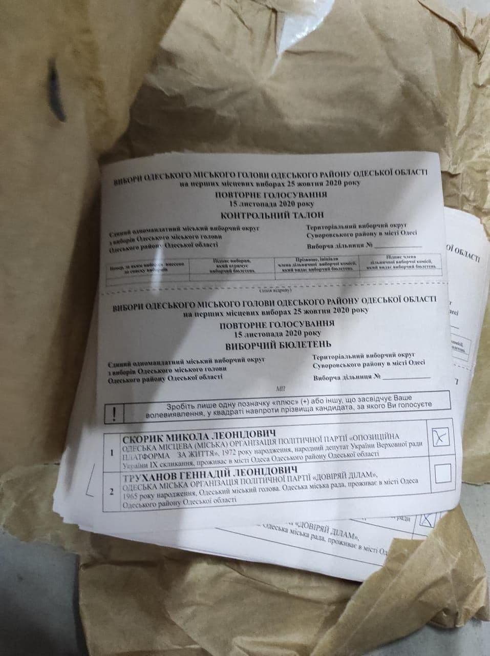 Между тем в телеграм-каналах распространяются фотографии бюллетеней с уже проставленным знаком напротив фамилии кандидата в мэры Николая Скорика, которые СБУ якобы изъяли во время обыска.