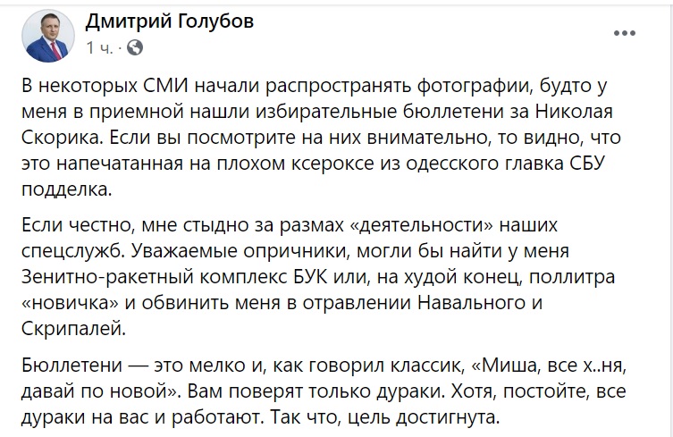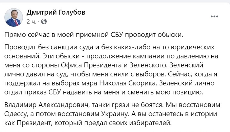 «Прямо сейчас в моей приемной СБУ проводит обыски. Проводит без санкции суда и без каких-либо на то юридических оснований. Эти обыски - продолжение кампании по давлению на меня со стороны Офиса Президента и Зеленского», - утверждает Дмитрий Голубов.