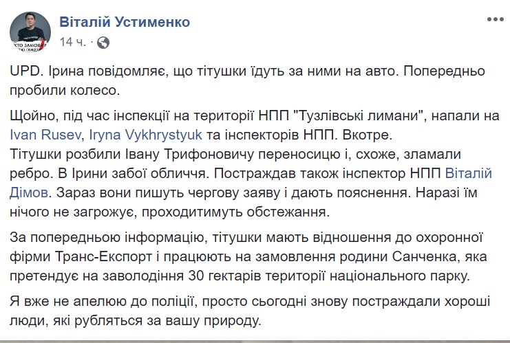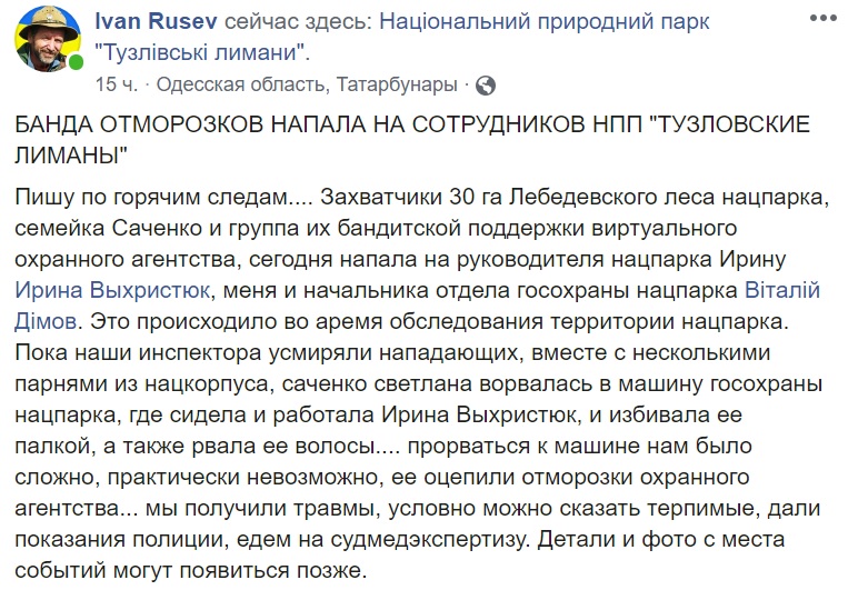 «Это происходило во время обследования территории Нацпарка. Пока наши инспектора усмиряли нападающих, вместе с несколькими парнями из нацкорпуса, Светлана Савченко ворвалась в машину госохраны нацпарка, где сидела и работала Ирина Выхристюк, и избивала ее палкой, а также рвала ее волосы... Прорваться к машине нам было сложно, практически невозможно, ее оцепили отморозки охранного агентства... Мы получили травмы, условно можно сказать терпимые, дали показания полиции, едем на судмедэкспертизу», - написал он.