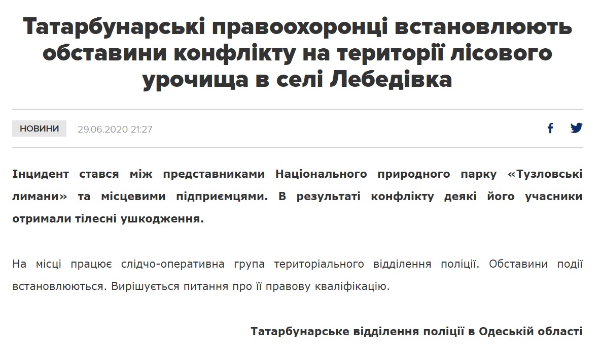 В полиции конфликт прокомментировали сдержано: «Инцидент произошел между представителями Национального природного парка «Тузловские лиманы» и местными предпринимателями. В результате конфликта некоторые его участники получили телесные повреждения. Обстоятельства происшествия устанавливаются. Решается вопрос о его правовой квалификации».