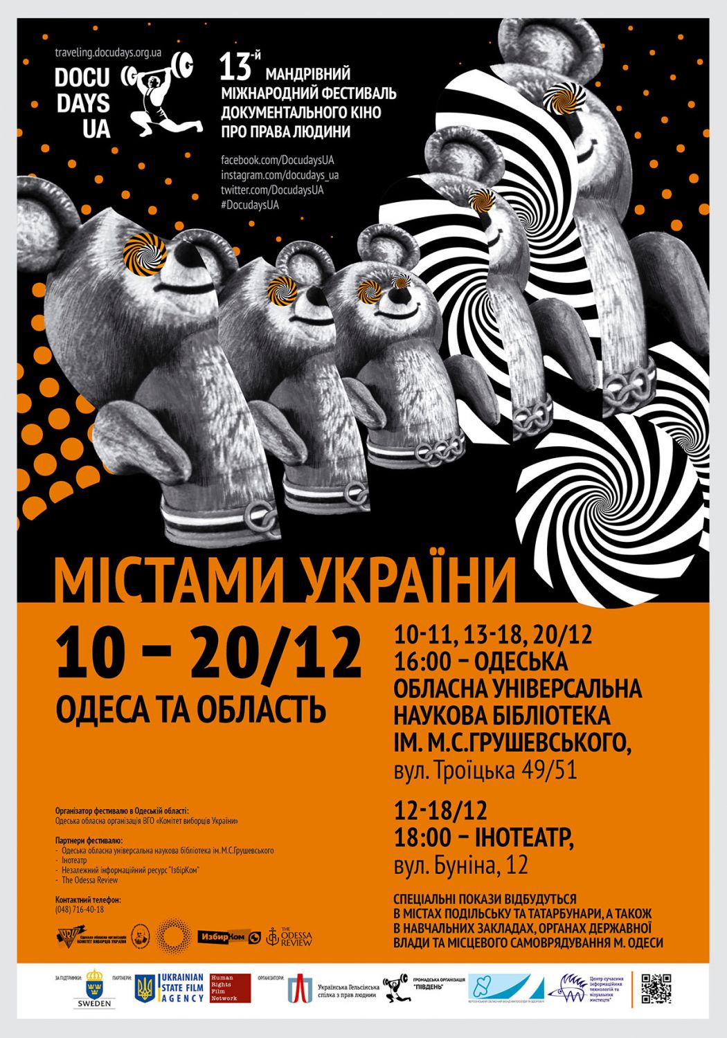 Показы документальных фильмов в рамках XIІІ Путешествующего международного фестиваля документального кино о правах человека Docudays UA пройдут с 10 по 20 декабря 2016 года в Одессе, Татарбунарах и Подольске