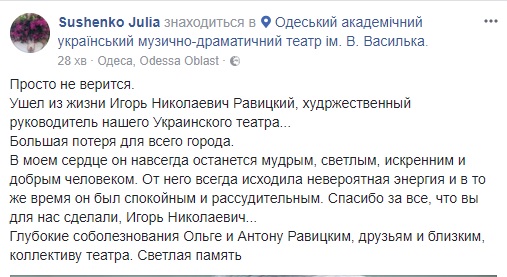 Сегодня утром, 29 октября, ушел из жизни художественный руководитель Одесского украинского театра имени В. Василько, народный артист Украины Игорь Равицкий. Об этом на своей странице в Facebook сообщила журналистка Юлия Сущенко.