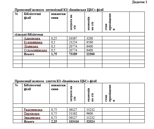 Так, «оптимизировать» путем ликвидации хотят Сухомлиновскую библиотеку, Лизинскую, Куяльницкую и Адамовскую. Также собираются объединить взрослые и детские библиотеки (при этом сократят сотрудников) в Петровке, Радостном и Знаменке. Благодаря таким мероприятиям власти надеются сэкономить более 55 тыс. грн на зарплатах, и оставив без работы семь человек (которые работают на 0,25, 0,5 и 0,75 ставки).