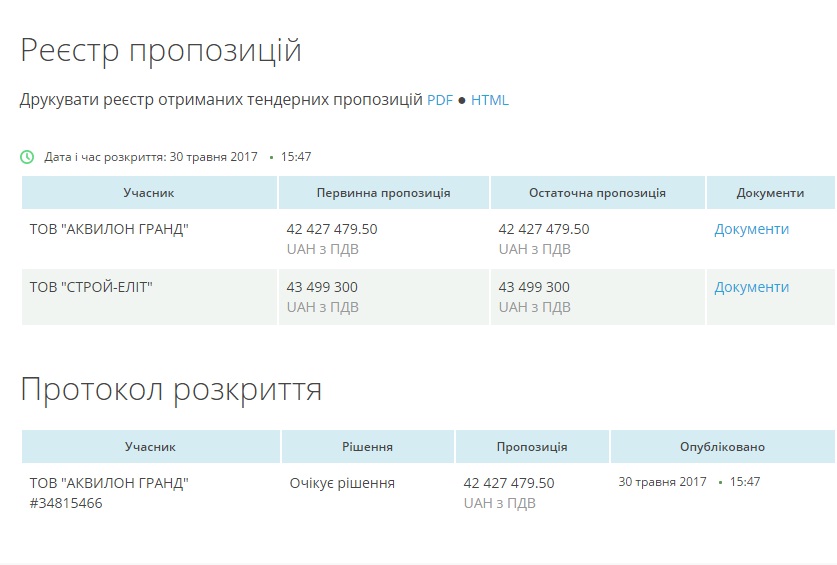 На сегодняшний день торги находятся в стадии «квалификация победителя», в качестве которого рассматривается компания «Аквилон Гранд», которая согласилась работать за 42 миллиона 427 тысяч 479.5 гривень. Конкурент предлагал свои услуги за 43 миллиона 499 тысяч 300 гривень, а ожидаемая стоимость закупки была 43 миллиона 966 тысяч 300 гривень. Компания «Аквилон Гранд» сообщила о намерении привлекать к реализации проекта субподрядчиков.