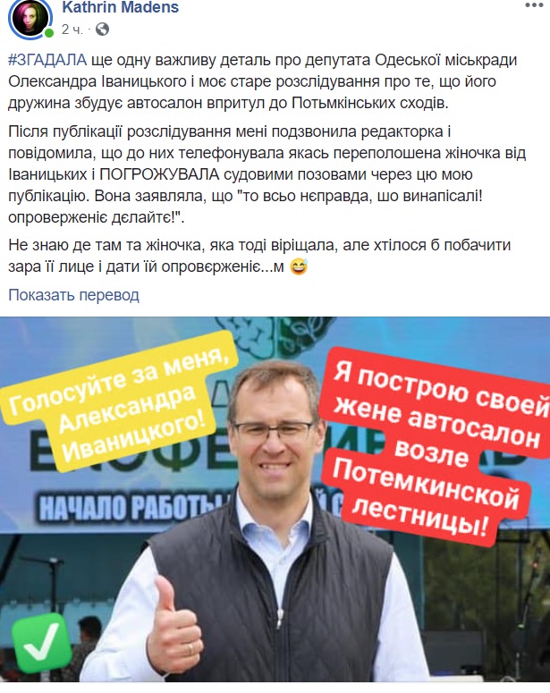 «Вспомнила еще одну важную деталь о депутата Одесского горсовета Александра Иваницкого и мое старое расследования о том, что его жена построит автосалон вплотную к Потемкинской лестнице. После публикации расследования мне позвонила редактор и сообщила, что к ним звонила какая-то испуганная женщина от Иваницкого и угрожали судебными исками за эту мою публикацию. Она заявляла, что «это все неправда, шо вы написали! Опровержения делайте!»», - написала она.
