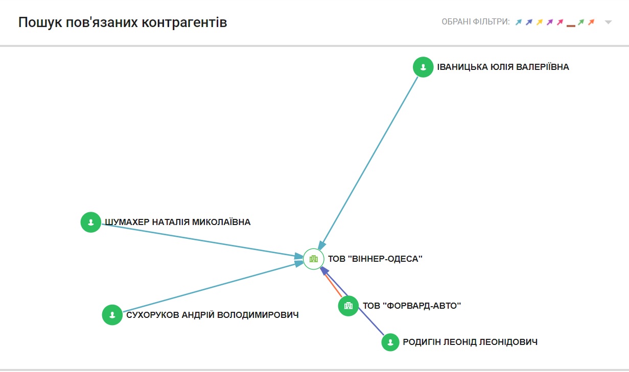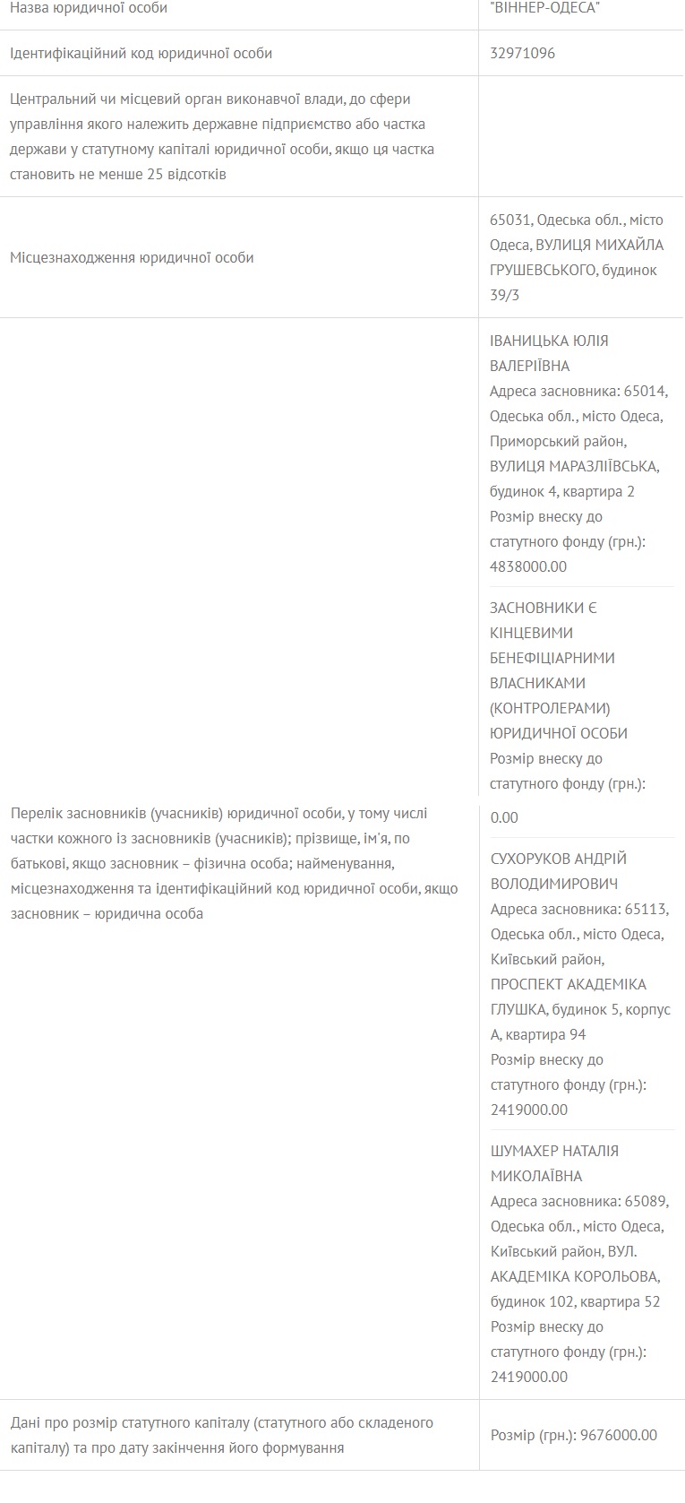 Единый реестр юридических лиц, физических лиц предпринимателей и общественных формирований сообщает, что конечными бенефициарами этой компании являются Андрей Сухоруков и две супруги депутатов Одесского горсовета от партии «Доверяй делам». Это — Юлия Иваницкая, жена Александра Иваницкого и Наталья Шумахер, жена Юрия Шумахера.
