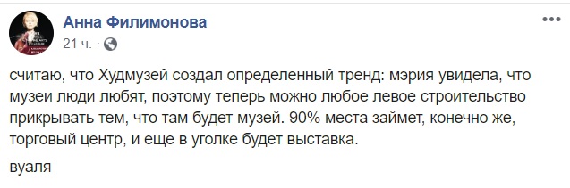 «Считаю, что Худмузей создал определенный тренд: мэрия увидела, что музеи люди любят, поэтому теперь можно любое левое строительство прикрывать тем, что там будет музей. 90% места займет, конечно же, торговый центр, и еще в уголке будет выставка. Вуаля», - написала она в Facebook.