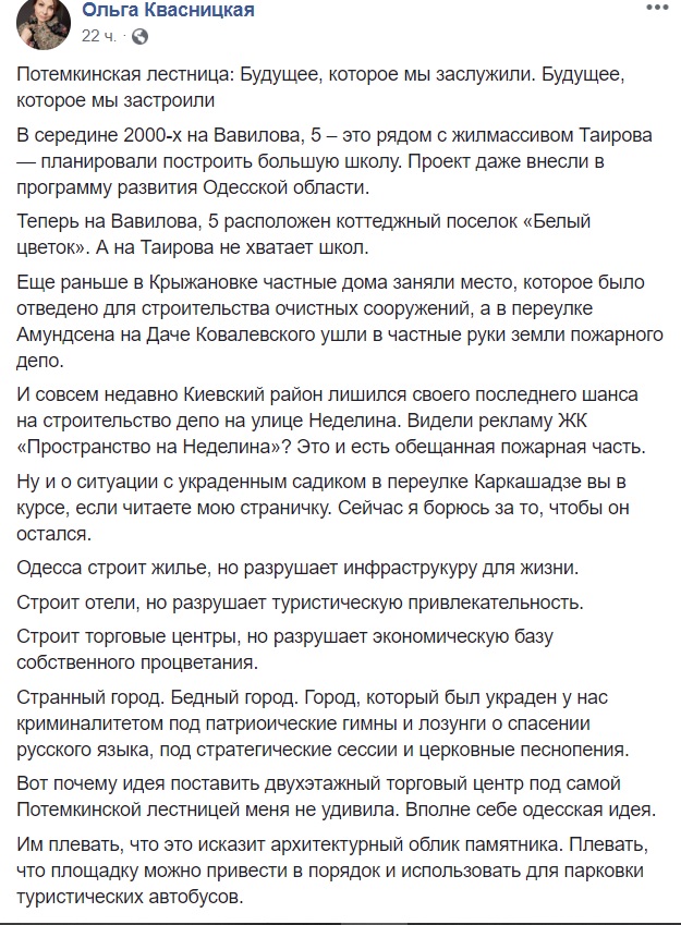 «Идея поставить двухэтажный торговый центр под самой Потемкинской лестницей меня не удивила. Вполне себе одесская идея. Им плевать, что это исказит архитектурный облик памятника. Плевать, что площадку можно привести в порядок и использовать для парковки туристических автобусов», - заявила она.