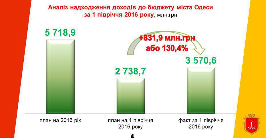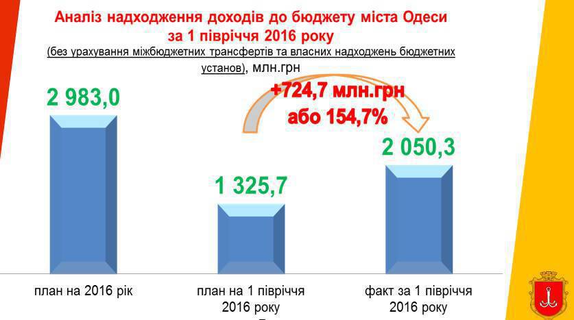 При этом основными бюджетоформирующими источниками доходов бюджета города Одессы являются налог на доходы физических лиц (фактические поступления за I полугодие 2016 составили 978 млн 270,9 тыс. грн, рост составил 1,5 раза); плата за землю (фактические поступления за I полугодие 2016 составили 340 млн 157,7 тыс. грн, что больше, чем в прошлом году, в 1,8 раза); единый налог (фактические поступления за I полугодие составили 260 млн 221,9 тыс. грн, рост также составил 1,5 раза); акцизный налог (фактические поступления за I полугодие 2016 составили 176 млн 632,6 тыс. грн, рост – в 1,6 раза).