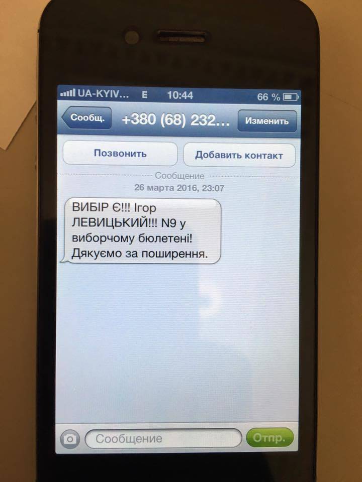 14:49 Сообщение с прямым и косвенным призывом голосовать за того или иного кандидата получили на свои телефоны жители Кривого Рога. Об этом сообщает ОПОРА. В частности, один из избирателей продемонстрировал наблюдателю ОПОРЫ полученное с незнакомого номера СМС-сообщение с призывом поддержать кандидата на должность городского головы Игоря Левицкого.
