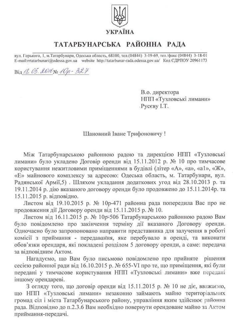 Татарбунарский районный совет требует от руководства Национального природного парка «Тузловские лиманы» освободить офис до 1 июня 2016 года.