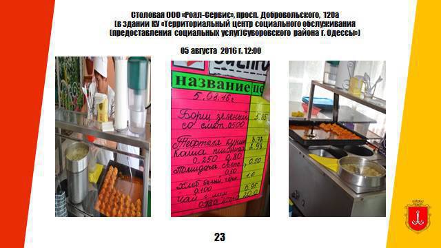 Комиссия ознакомилась с результатами внеплановой проверки 4-5 августа 2016 года организации питания в столовых ООО «Варион» (ул. Варненская, 15, ул. Черноморского казачества, 13), ООО «Роял-Сервис» (проспект Добровольского, 120-а) и ООО «Восток» (ул. Ак. Филатова, 20), а также заслушала отчет директора департамента труда и социальной политики Одесского горсовета Елены Китайской о порядке организации питания в столовых.