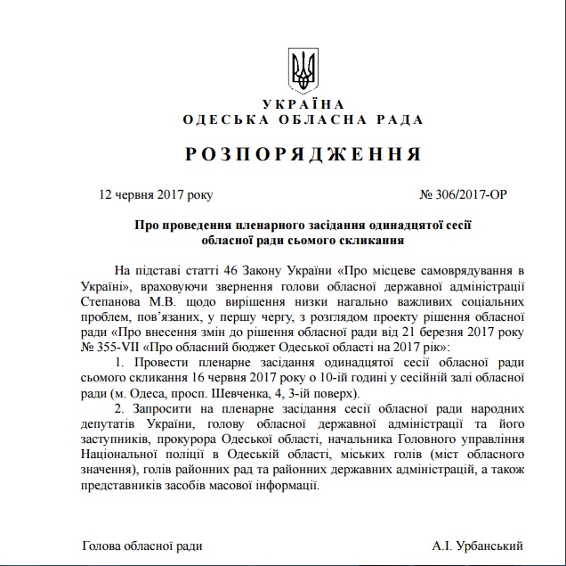 В документе сказано, что распоряжение продиктовано статьей 46 Закона Украины «О местном самоуправлении в Украине» и обращением председателя областной государственной администрации Максима Степанова, который попросил облсовет собраться для срочного решения ряда важных социальных проблем, связанных, в первую очередь, с рассмотрением проекта решения областного совета «О внесении изменений в решение областного совета от 21 марта 2017 года «Об областном бюджете Одесской области на 2017 год».
