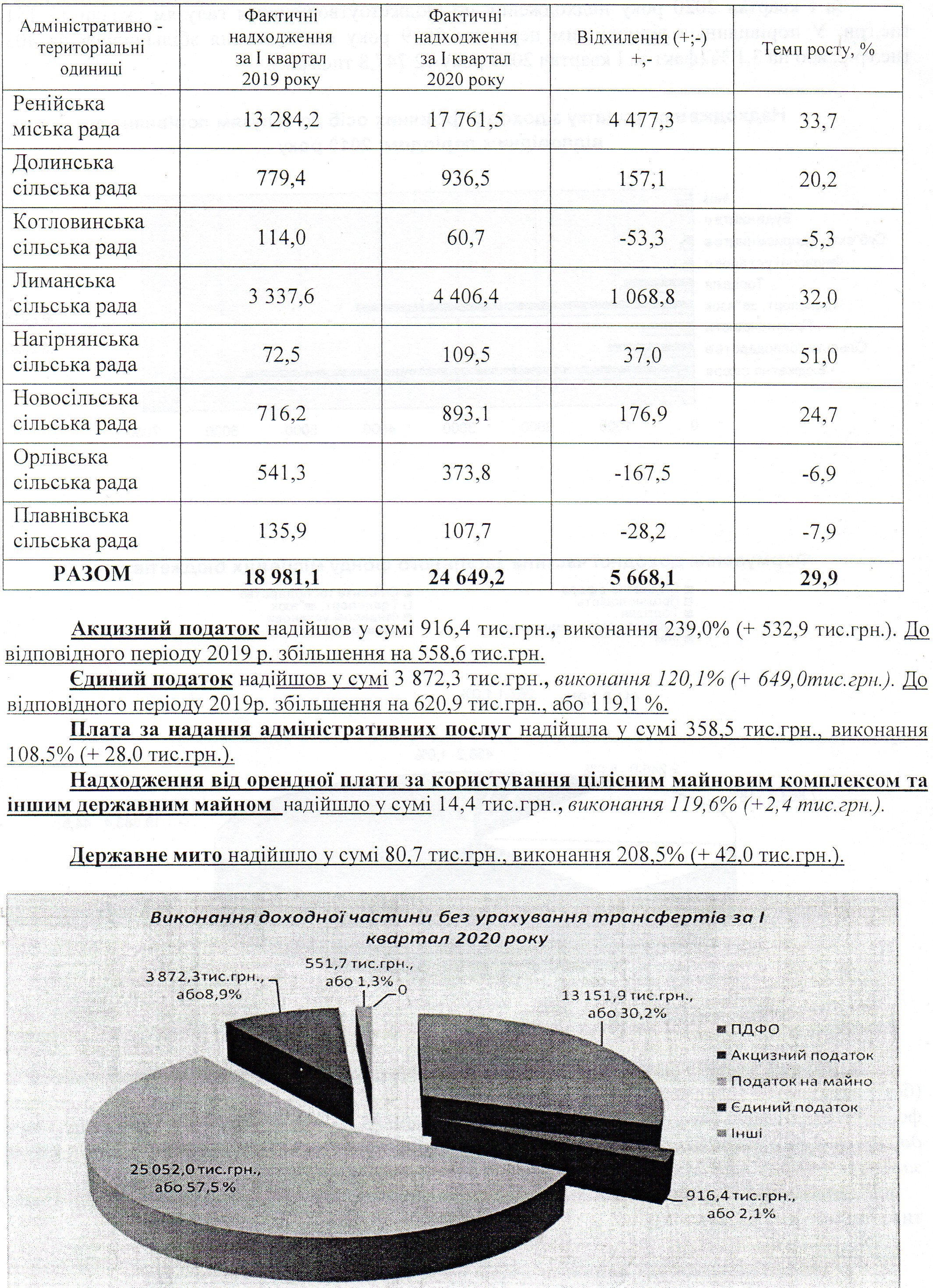 Есть еще одна интересная табличка «Анализ поступлений платы за землю в разрезе городского и сельских советов за I квартал 2020 года». Интересна она в свете грядущего создания Ренийской объединенной громады. В ней указано, что поступление земельного налога, по сравнению с I кварталом 2019 года увеличилось на 30%, с 18 миллионов 981 тысячи гривень до 24 миллионов 649 тысячи гривень. Особенно высокие темпы роста 51% показал Нагорненский сельский совет, следом за ним Ренийский горсовет – 33,7% и Лиманский сельсовет – 32%. Но, если мы посмотрим на конкретные цифры, то 51% нагорненцев это 37 тысяч гривень, а 33,7% ренийцев это 4 миллиона 477 тысяч гривень. Доля Ренийского городского совета в этом пироге составляет 17 миллионов 761 тысячу гривень или 72%. При этом поступление земельного налога по трем сельским советам Котловинскому, Орловскому и Плавнинскому «ушло в минус».